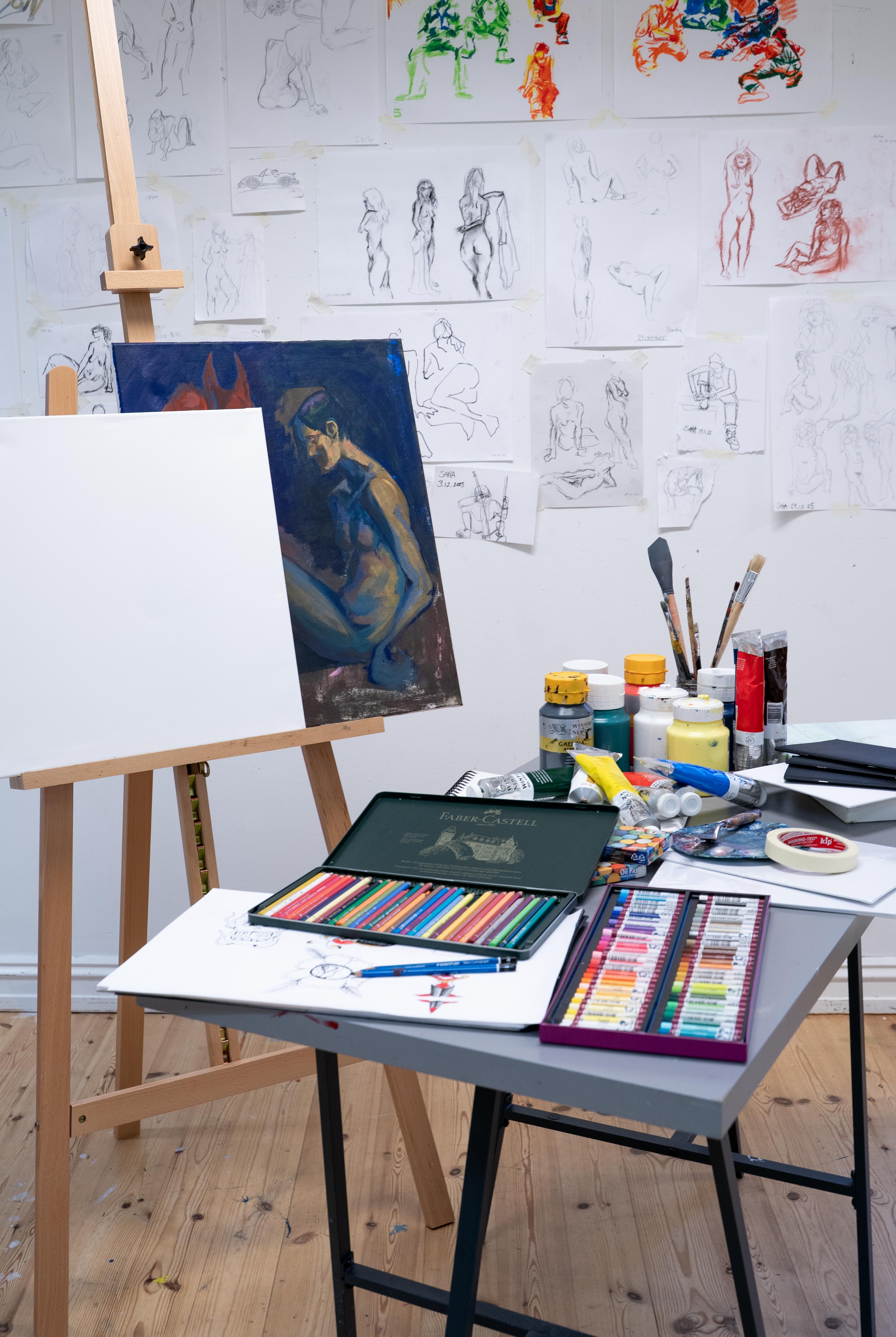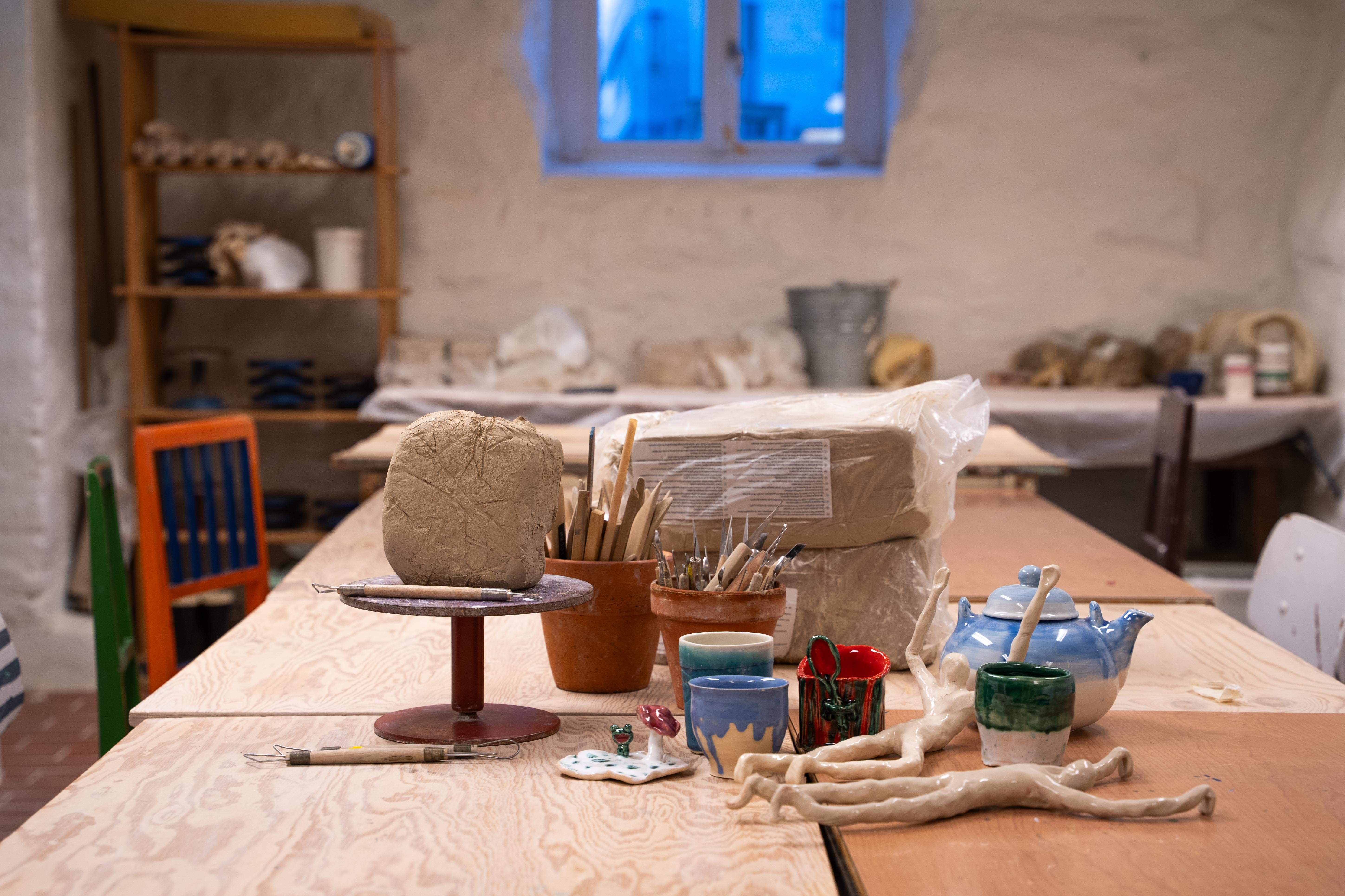 Vi har et stort utvalg av tegnesaker, med alt fra Promarker-tusjer til kull og kritt. Det er tilgang til Mac med Adobe-programmene og Wacom Intuos-tegnebrett til utlån. Lokalene rommer to gode arbeidsrom, et keramikkverksted og et eget «sofarom» hvor det er mulig å ta en kopp te og skravle i pausene. Det finnes også symaskiner med tilhørende syutstyr, samt materialer til modellbygging. For malerarbeid er det staffelier og malesaker til akvarell, akryl og olje. I tillegg er det papirkutter, kuttebrett og et stort utvalg av ulike papirtyper, samt utstyr og materialer til grafikk.
